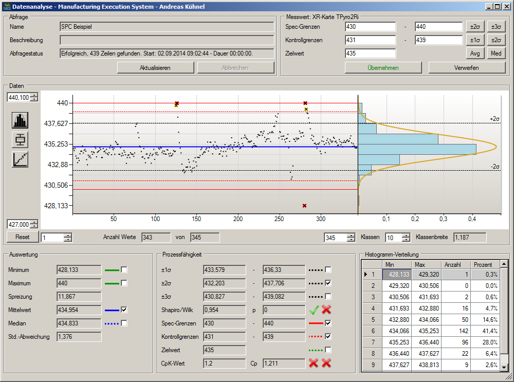 Zur Analyse der Prozessfähigkeit wird ein Dialog bereitgestellt, mit dem die Verteilung der Prozessdaten analysiert werden kann. Über mathematische und grafische Methoden wird die Bewertung der Daten unterstützt.